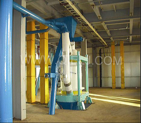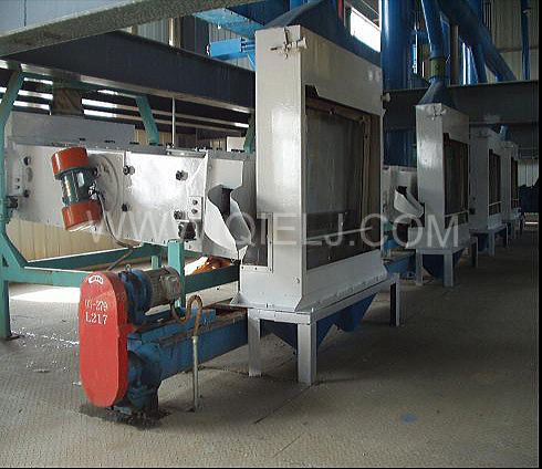 清理工序:采用磁選器去除鐵雜;振動(dòng)清理篩去除大雜、秸稈等;比重去石機(jī)去除石子和磚塊等重雜;除塵系統(tǒng)采用單聯(lián)剎克龍以及離心風(fēng)機(jī)進(jìn)行有效的除塵,以保證車(chē)間衛(wèi)生和清理輕雜。