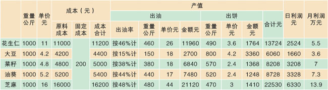 2. 出油率:每百斤出14斤油,油單價(jià):5元/斤